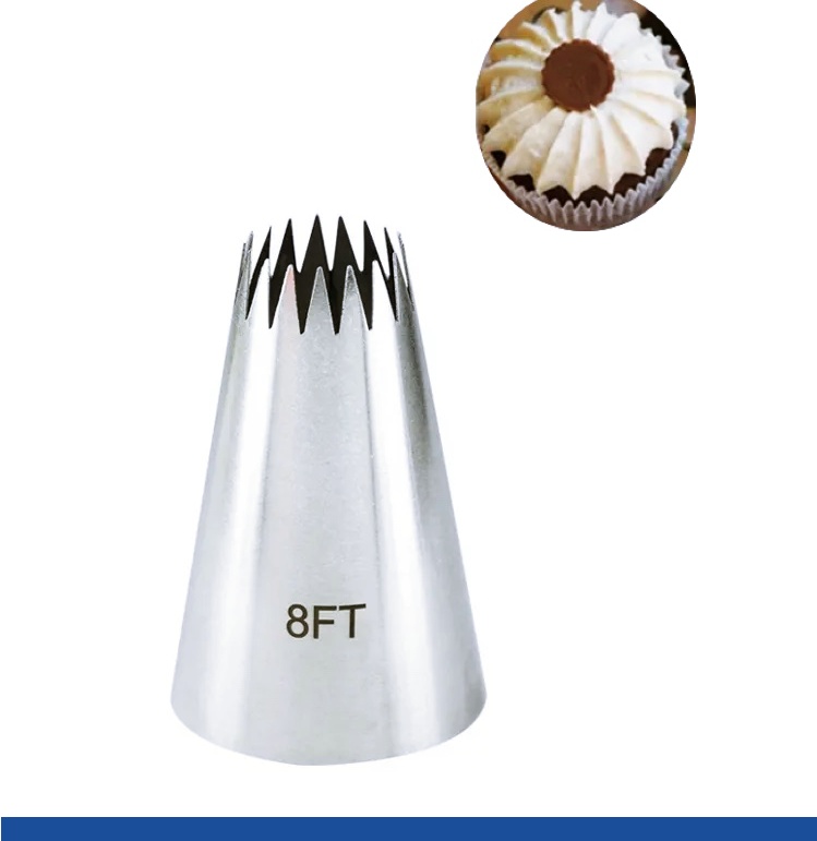 Кондитерская насадка открытая звезда 8FT (французкая трубочка или звезда) имеет около 18 прямых лучей, верхний диаметр около 16 мм. Используются как для отсаживания крема, так и для теста. Подходит для использования со средним переходником.